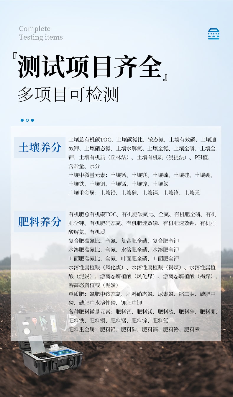 2、肥料養分:●有機肥總有機碳TOC、有機肥碳氮比、全氮、有機肥全磷、有機肥全鉀、有機肥硝態氮、有機肥速效磷、有機肥速效鉀、有機肥酸解氮、有機質;●復合肥碳氮比、全氮、復合肥全磷、復合肥全鉀;●水溶肥碳氮比、全氮、水溶肥全磷、水溶肥全鉀;●葉面肥碳氮比、全氮、葉面肥全磷、葉面肥全鉀;●水溶性腐植酸(風化煤)、水溶性腐植酸(褐煤)、水溶性腐植酸(泥炭)、游離態腐植酸(風化煤)、游離態腐植酸(褐煤)、游離態腐植酸(泥炭);●單質肥:氮肥中銨態氮、肥料硝態氮、尿素氮、縮二脲、磷肥中磷、磷肥中水溶性磷、鉀肥中鉀;●各種肥料微量元素:肥料鈣、肥料鎂、肥料硫、肥料硅、肥料硼、肥料鐵、肥料銅、肥料錳、肥料鋅、肥料氯;●肥料重金屬:肥料鉛、肥料砷、肥料鎘、肥料鉻、肥料汞。