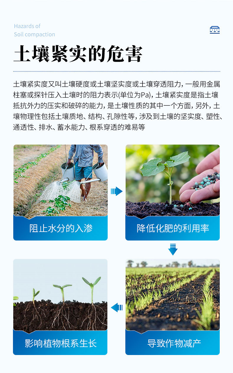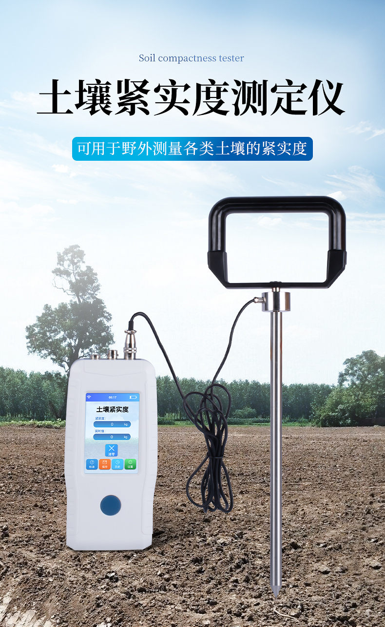 土壤緊實度由土壤抗剪力、壓縮力和摩擦力等構成。是土壤強度的一個合成指標。金屬柱塞或探針壓入土壤時分動載和靜載兩種方法,不同方法的測定值不同,但有聯系。柱塞的形狀有錐體、平頭、圓球及楔子等,這些對測定值也有影響。對同一種方法的測定值,主要決定于土壤質地、容重和含水量。其中含水量的影響最大。土壤緊實度可預測土壤承載量、耕性和根系伸展的阻力。土壤緊實度的大小可影響作物根系的穿孔和生長,是一個重要的土壤物理特性指標,用于評價土壤耕性。緊實的土壤可阻止水分的入滲,降低化肥的利用率,影響植物根系生長,導致作物減產。