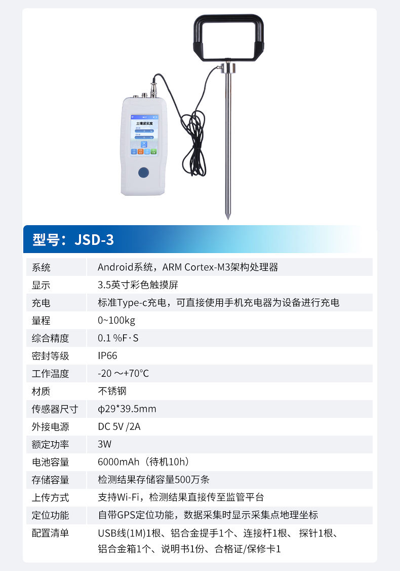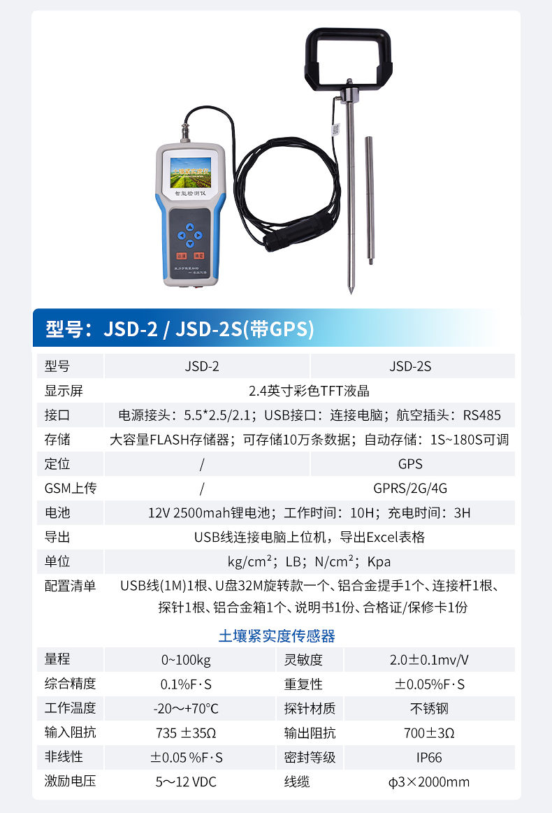 本設備是一種由手持式采集儀和緊實度傳感器所組成的一套土壤墑情監測系統。同時具備操作簡便,攜帶方便,檢測迅速可靠等優點,在領域中可謂獨樹一幟。手持式采集儀可根據用戶需要出廠配置GPS、GPRS數據上傳等功能,設備中的數據也可以通過USB數據線連接電腦,并將歷史數據導出到電腦中進行數據分析。