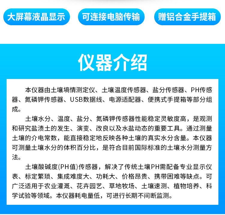 HM-TPH智能土壤PH測定儀采用一體化結構設計,外置SD卡,主機可以實時采集被測環境土壤的溫度、水分、鹽分、PH等多個參數,一鍵上傳數據等。