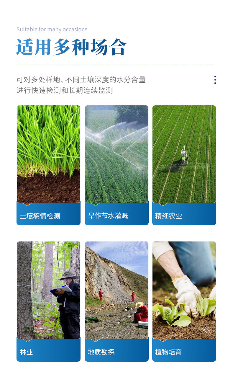 土壤水分測(cè)定儀采用FDR頻域反射原理,快速準(zhǔn)確測(cè)量土壤中含水量,可對(duì)多處樣地、不同土壤深度的水分含量進(jìn)行快速檢測(cè)和長(zhǎng)期連續(xù)監(jiān)測(cè)。廣泛應(yīng)用于土壤墑情檢測(cè)、旱作節(jié)水灌溉、精細(xì)農(nóng)業(yè)、林業(yè)、地質(zhì)勘探、植物培育等領(lǐng)域。