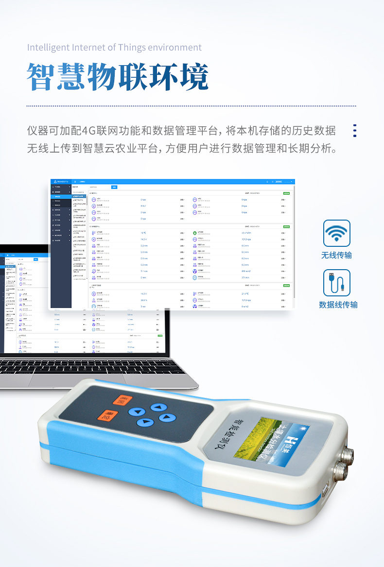 1、☆儀器可加配4G聯(lián)網(wǎng)功能和數(shù)據(jù)管理平臺(tái),將本機(jī)存儲(chǔ)的歷史數(shù)據(jù)無(wú)線上傳到智慧云農(nóng)業(yè)平臺(tái),方便用戶進(jìn)行數(shù)據(jù)管理和長(zhǎng)期分析。