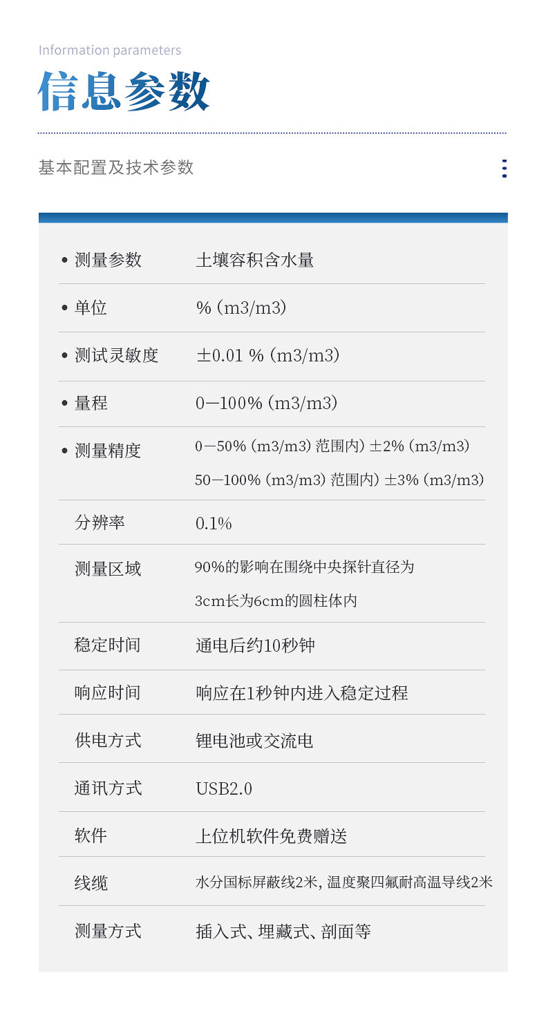 1、測(cè)量參數(shù):土壤容積含水量;