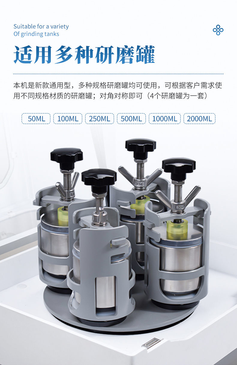 1. 適用研磨罐:本機是新款通用型,50ml、100ml、250ml三種規格研磨罐均可使用,可根據客戶需求使用不同規格材質的研磨罐;對角對稱即可(4個研磨罐為一套)。